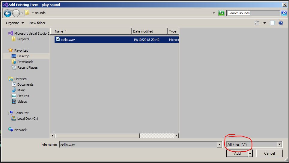 With that being done lets see how to add the sound file to the project. We have a simple WAV file in here, you can download it from here. We will use this WAV file on both of the buttons.